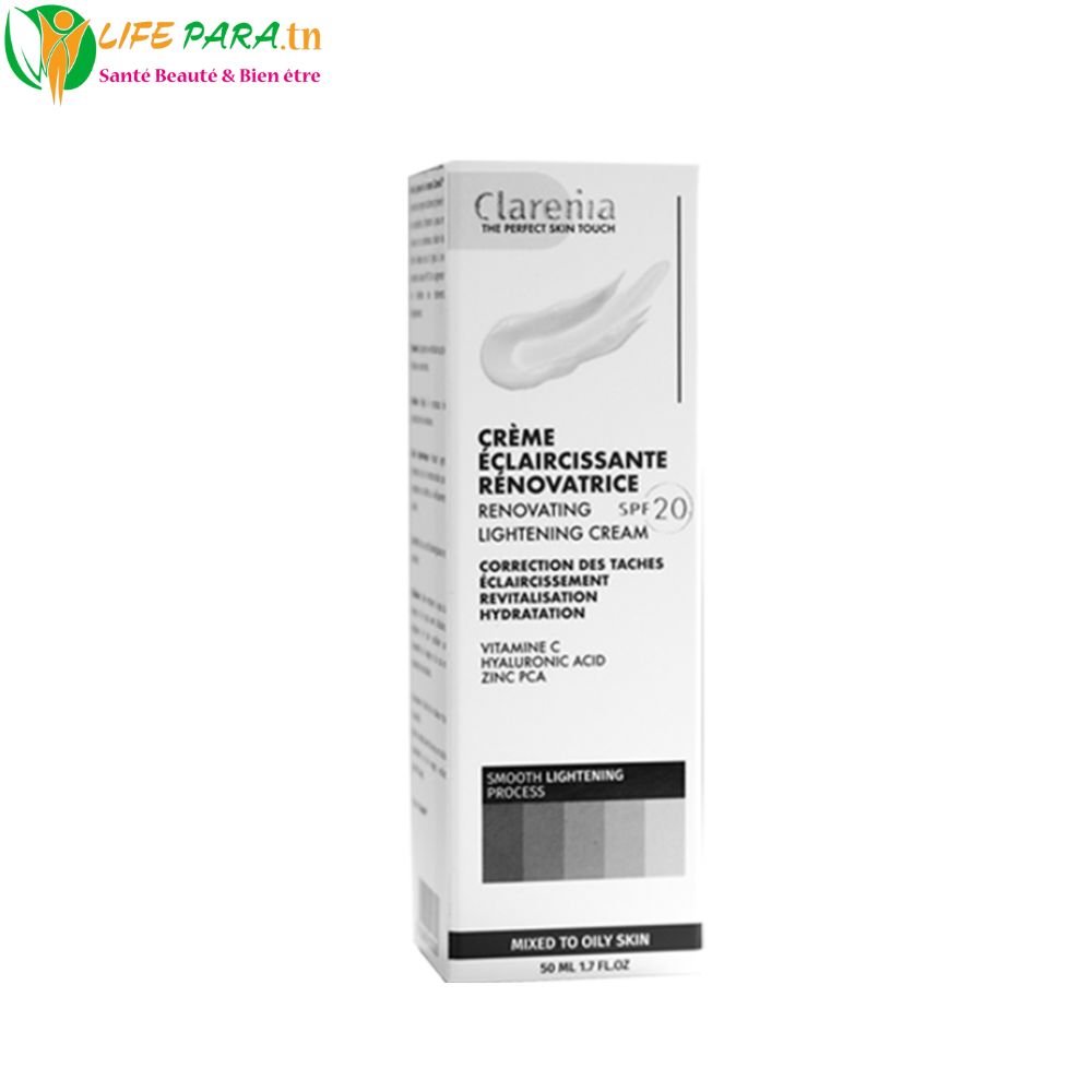source: https://clarenia.com/product/clarenia-creme-eclaircissante-renovatrice-spf20-peau-normale-a-seche-50ml/