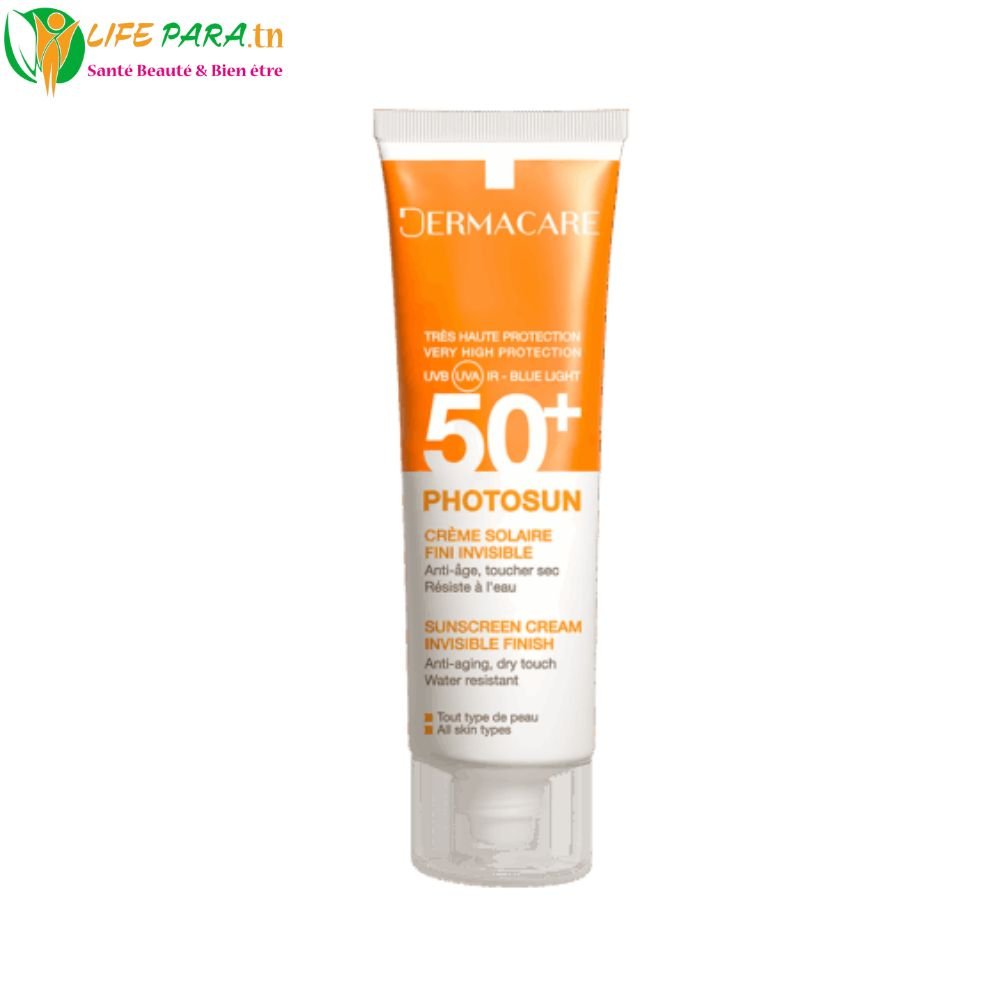 La Crème Fini Invisible PHOTOSUN de Dermacare offre une protection solaire haute performance SPF50+, idéale pour préserver la peau des rayons UVA et UVB.